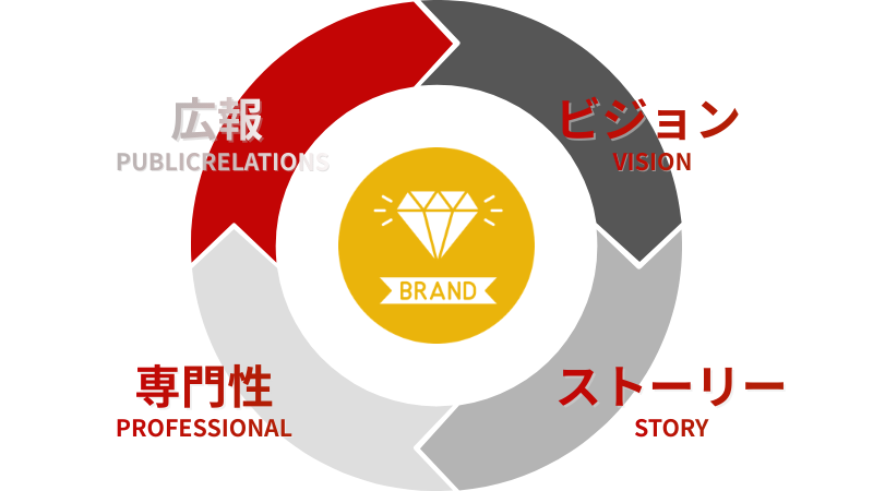 社長のブランドを確立するためには、次の3+1の要素で構成します。「ビジョン」社長が描く未来や、会社が目指す世界観「ストーリー」創業の背景や熱い想い、人生劇場など「専門・信用」どの分野の専門家なのか?何を約束できるのか?「発信」SNS・講演・記事などを通して広報することが重要です。